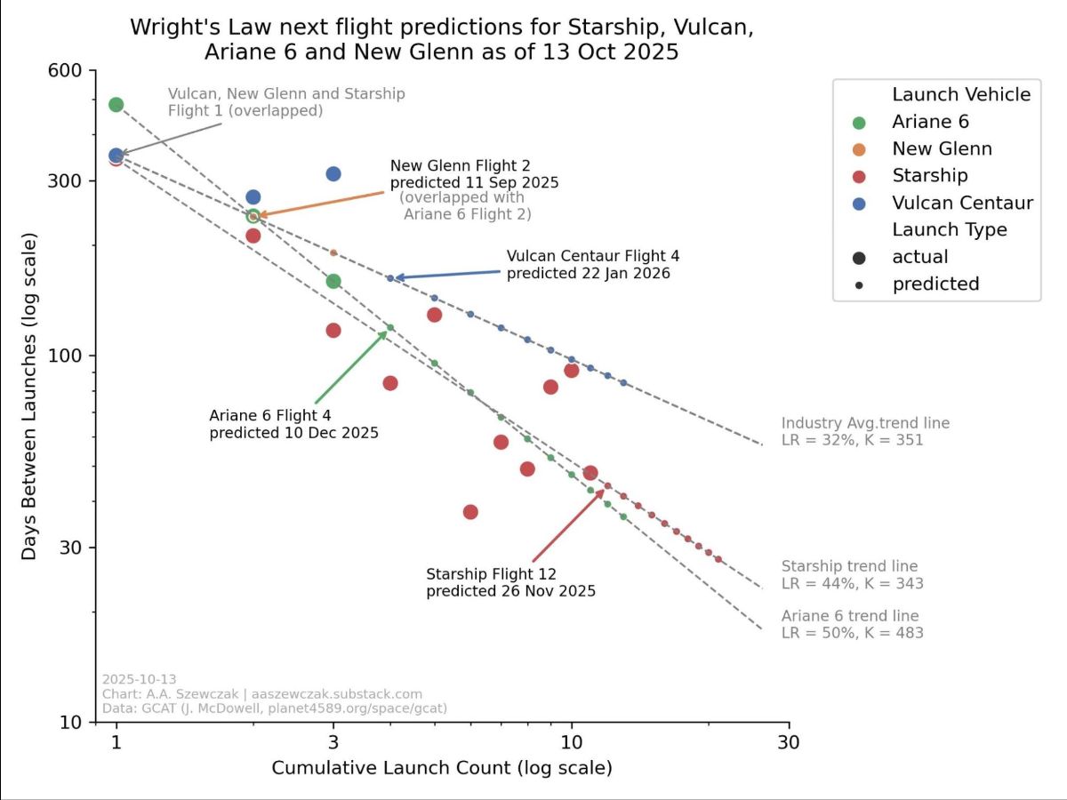 | Wright’s Law is based on Theodore Wright’s observation that every time aircraft production doubled, the labor time decreased by 20%: this was termed the industry’s “learning rate.” This law exactly predicted Flight 11’s launch on October 13th and often predicts rocket launch timelines with greater accuracy (~25 days) than the companies that build them. Wright’s Law predicts a Flight 12 in November next, but since Pad 2 is not ready, that date is unlikely. However, due to SpaceX’s production speed, when Pad 2 is complete, the company will likely have multiple V3 vehicles ready for launch, possibly maintaining the prediction’s current trend line. (Ariane 6 should also get a notable mention here, with a current learning rate of 50%.) Many other things also follow similar learning rates. Credit: Alex Szewczak |