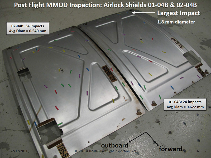| Two airlock shields from the ISS, inspected after being flown on the station for 8 years. The two shields had 54 debris impacts. Credit: NASA |