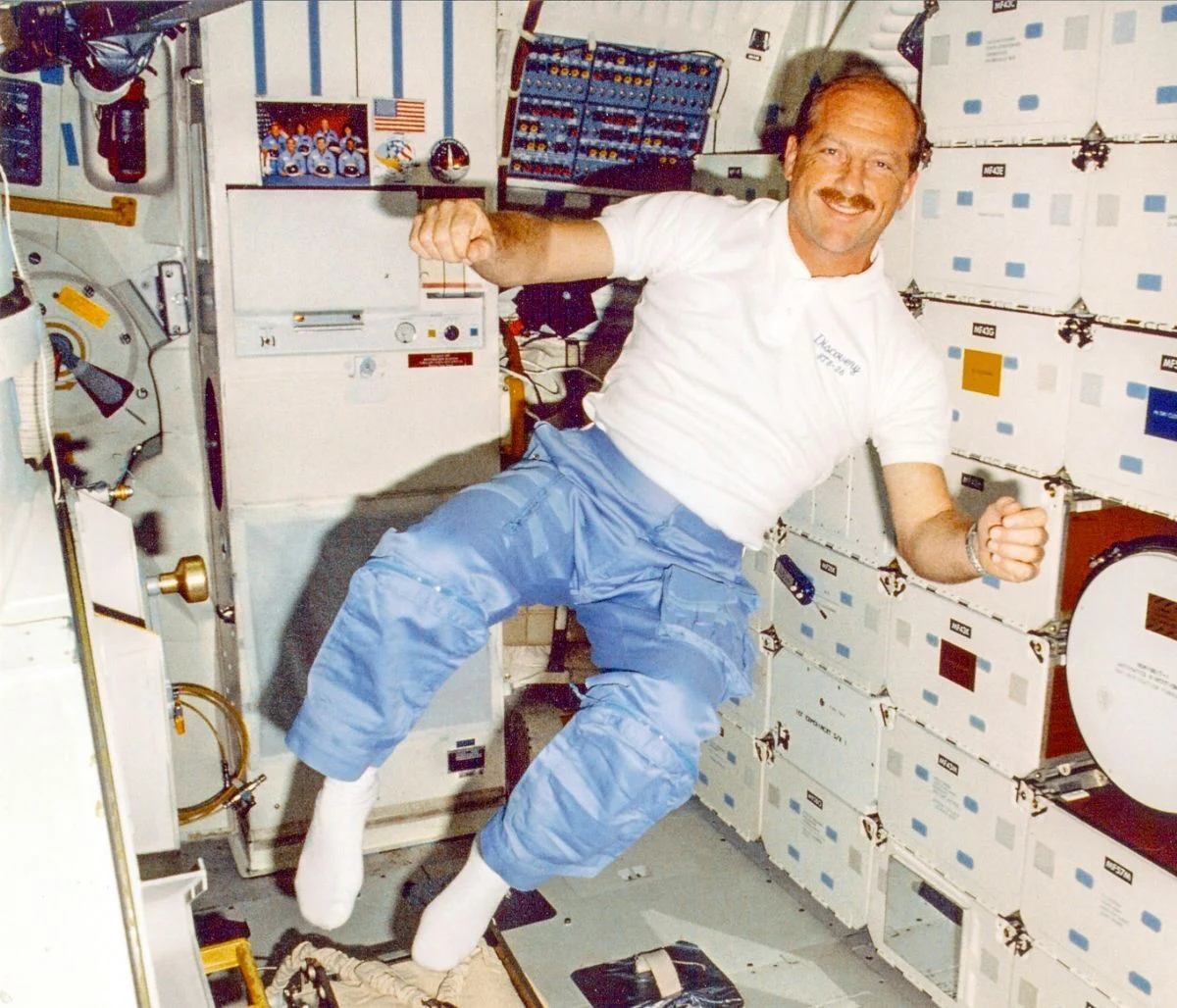 | STS-26 commander Rick Hauck, floating on the middeck of Discovery, beside a portrait and mission patch honoring the fallen Challenger crew. RIP. |